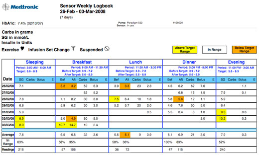 above: weekly data from a glucose monitor shows high and low levels detected by the sensor.